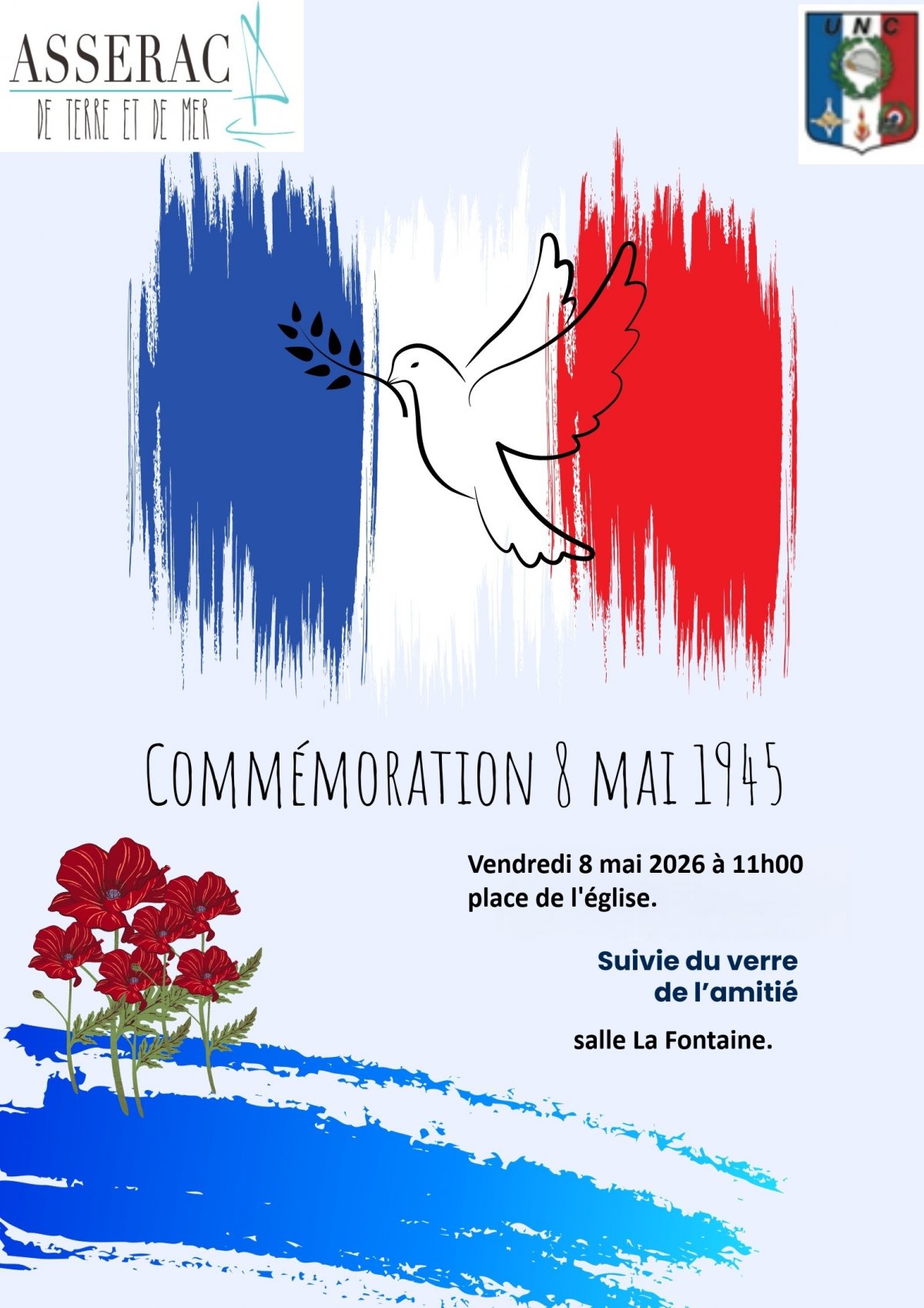 La cérémonie de commémoration du 8 mai 1945 débutera le vendredi 8 mai 2026 à 11h00 place de l’église en présence des élus de la commune et de l’UNC (Union Nationale des Combattants).