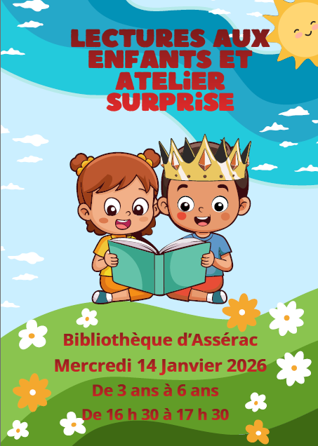 Lectures aux enfants et Atelier Surprise à la Bibliothèque d’Assérac pour les 3 – 6 ans le mercredi 14 janvier 2026 de 16h30 à 17h30 sans inscription.